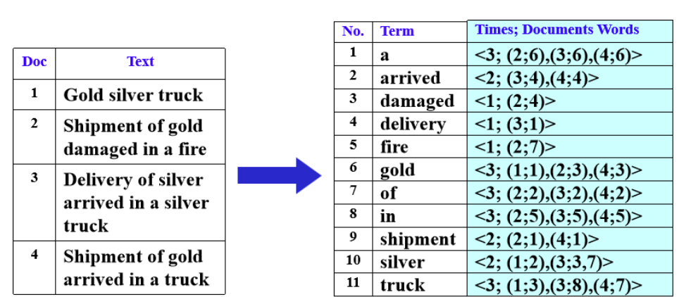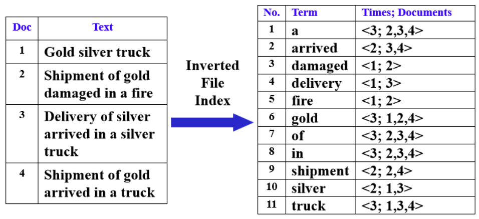 - Inverted file contains a list of pointers (e.g. the number of a page) to all occurrences of that term in the text.