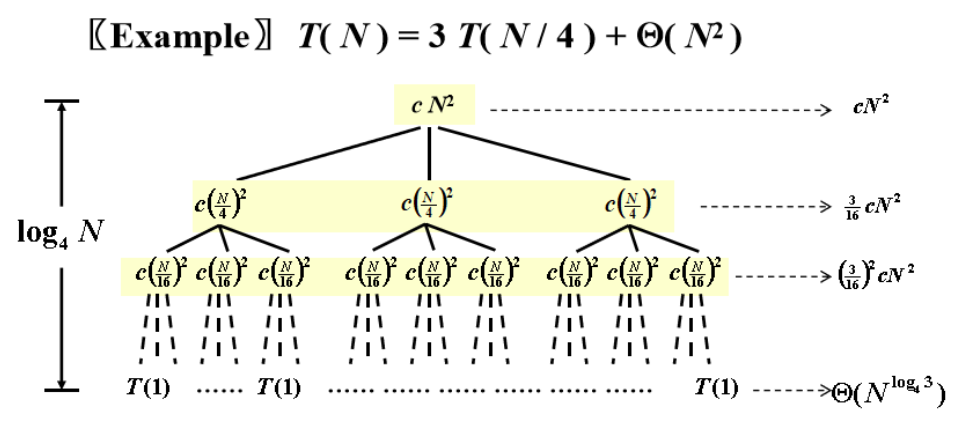 - If $f(N)=\Theta(N^{log_b{a}})$, or $\frac{a}{b^c}=1$, $T(N)=\Theta(log_b{N}N^c)$.