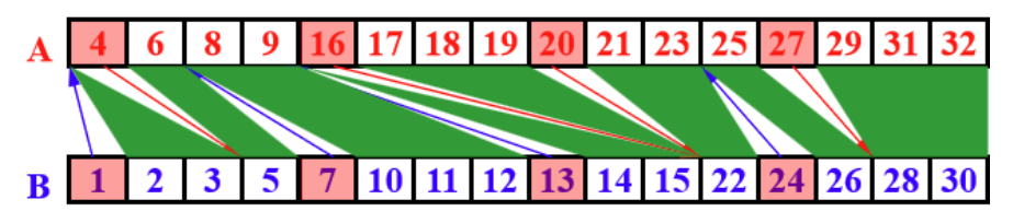 If we define the $rank(i,A)$ as the rank of $A[i]$ in $B$ and $rank(i,B)$ as the rank of $B[i]$ in $A$, for the merge operation, we can use the following algorithm:
